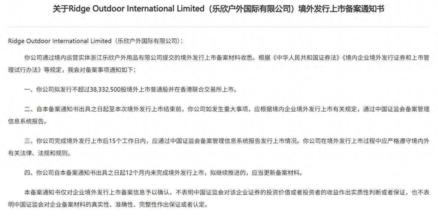 智通财经APP获悉,12月19日散户炒股,中国证监会国际合作司发布《关于Ridge Outdoor International Limited(乐欣户外国际有限公司)境外发行上市备案通知书》。该公司拟发行不超过38,332,500股境外上市普通股并在香港联合交易所上市。据悉,乐欣户外已于2025年6月27日向港交所递交上市申请,中金公司为独家保荐人。